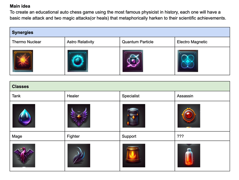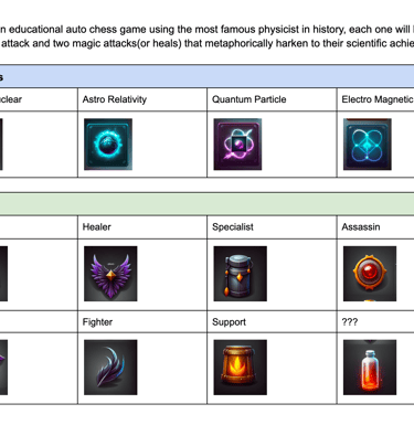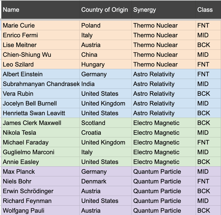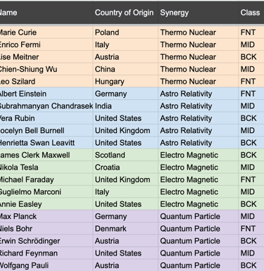 Much like many other auto-chess battlers the idea would be to have a few main synergies and then some sub-classes. The main synergies in this game represent the character's main science path and the best categorization of their prominent discovery.