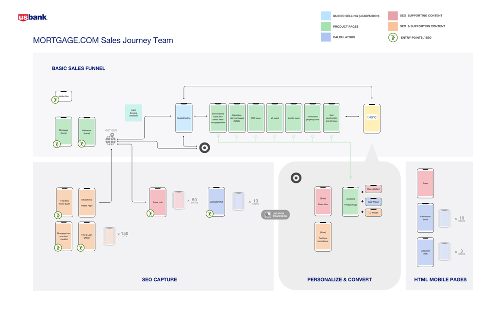 The actual mortgage funnel and ecosystem had never really been mapped out, so I set out to get a bird's eye view of what we have to serve our users and how it flows. Generally, if there is a missing document that can align the team, I will be making it.